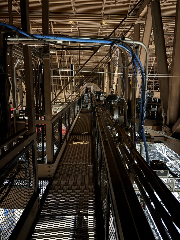 Days later as I rode to the event center, I started regretting my decision. Even before arrival, I was nervous. As we walked through the seats toward the small metal ladder at the back, I may have looked calm but inside felt my guts twisted, like a man walking toward his execution! Once on the catwalk, I could see straight down between the grate to the stage 50 feet below. Even on the platform, my palms were sweating and my mouth went dry and stiff.
