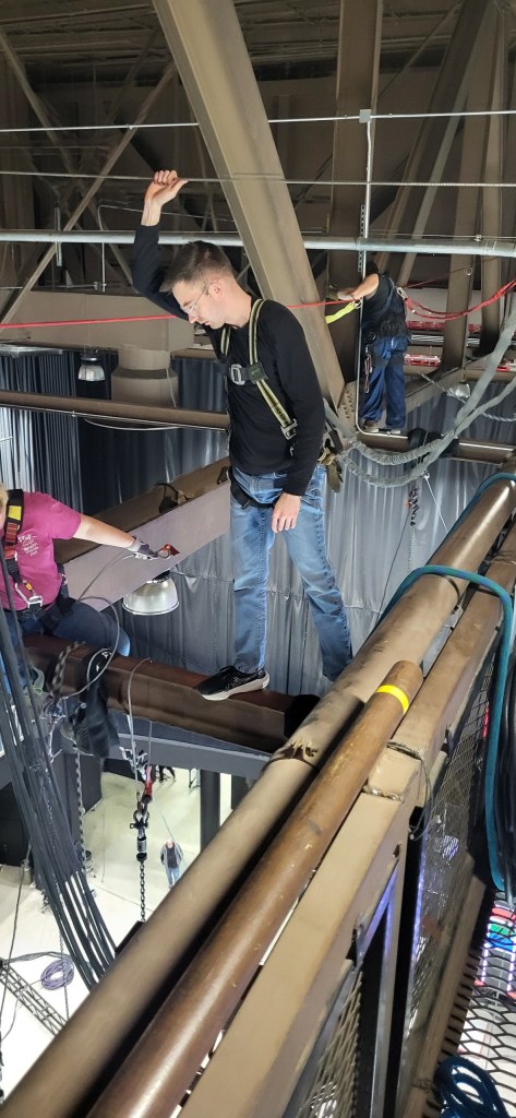 Several cousins work occasionally in “entertainment rigging”: climbing to the top of a concert hall or stadium to lift equipment for a show. They’ve encouraged me to join them before, but I brushed it off, thinking, “Are you kidding? No way!”